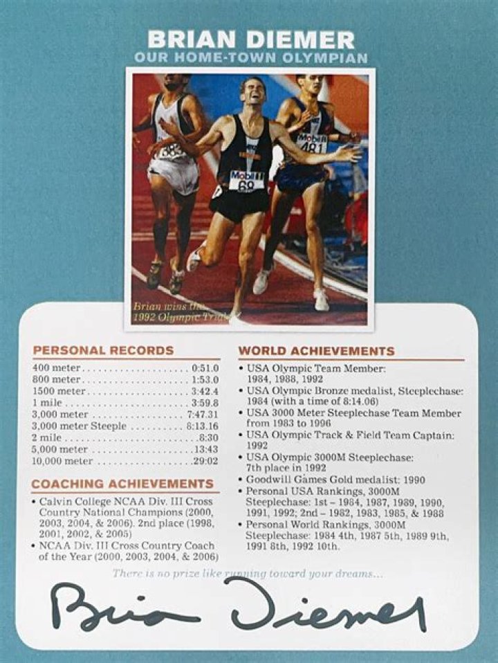 Brian Lee Diemer (born October 10, 1961 in Grand Rapids, Michigan) is a former American track and field athlete, who mainly competed in the 3000 metre steeplechase during his career. He was high school state champion in the mile while running at South Christian High School in Grand Rapids, Michigan. He graduated from the University of Michigan in 1983 after taking third in the 2 mile at the NCAA Indoor Track and Field Championships, held in nearby Detroit. He won the outdoor 1983 NCAA 3000m Steeplechase in a time of 8:26.95.