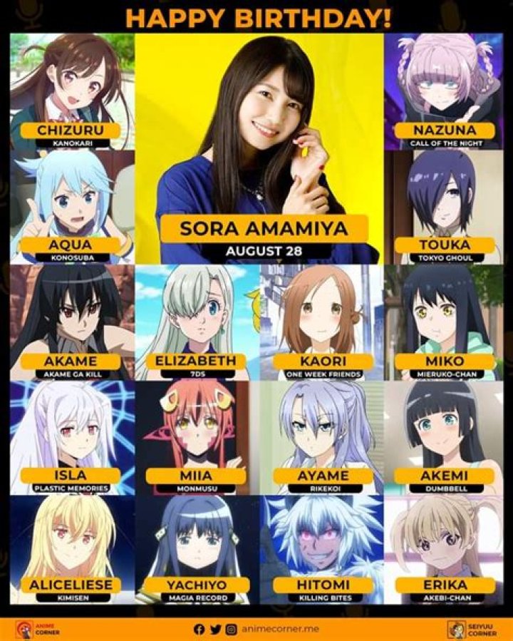 So Ranked on the list of most popular Voice Actress. Also ranked in the elit list of famous people born in Japan. Sora Amamiya celebrates birthday on August 28 of every year.